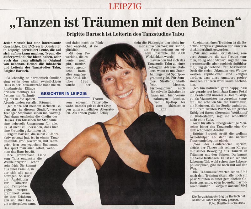 Da waren wir wirklich sprachlos, als uns am Freitag, den 30. November 2007 dieser LVZ-Artikel in die Hände viel: Ein Portrait von Gitti in der Rubrik „Gesichter in Leipzig“ mit dem Titel „Tanzen ist träumen mit den Beinen“ …
